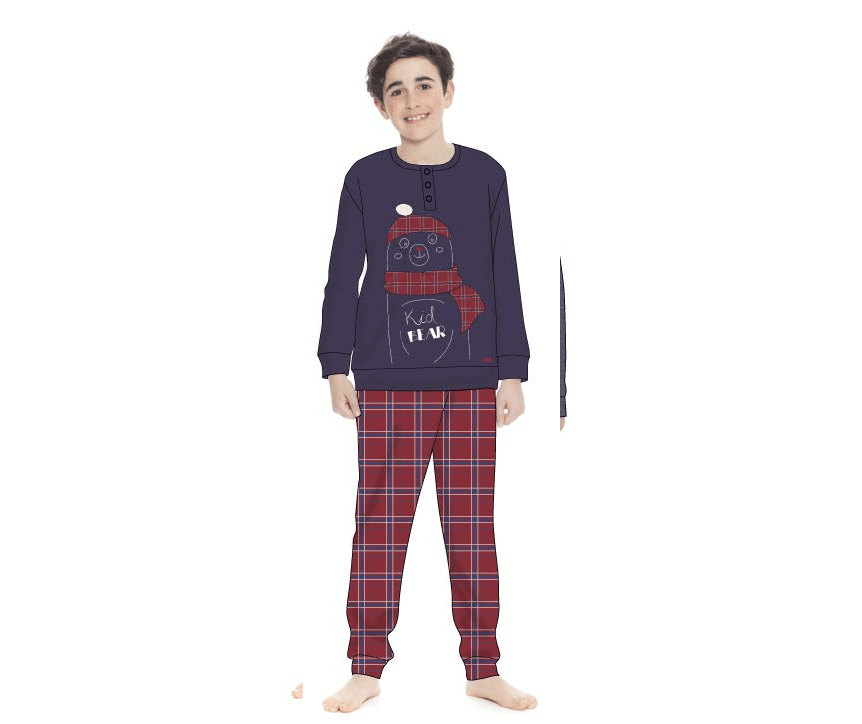 Pigiama serafino in caldo cotone interlock, giacca con stampa orso e pantalone scozzese.