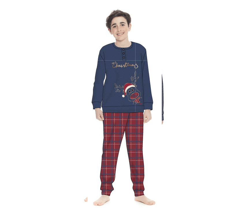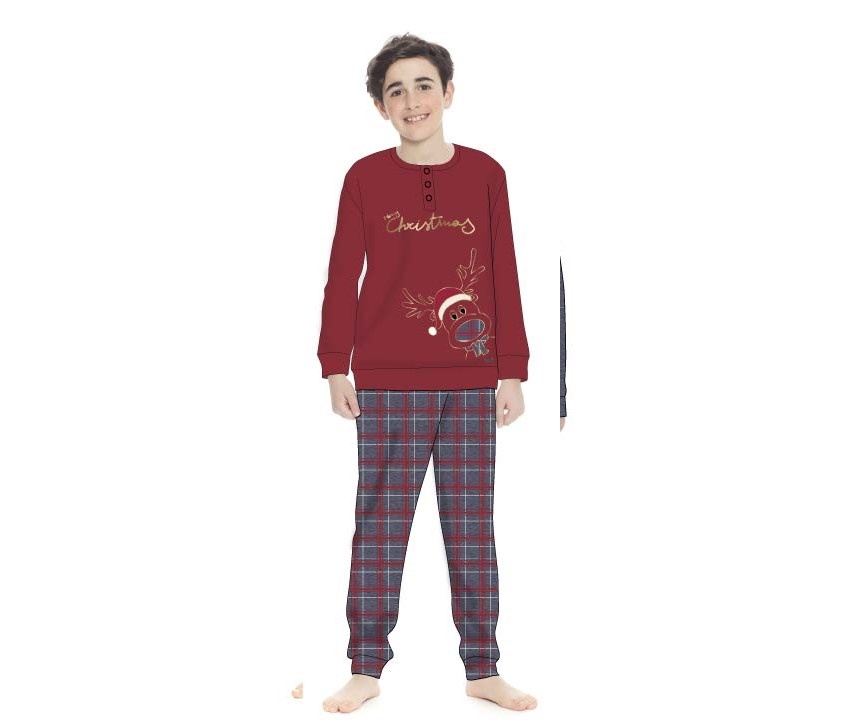 Pigiama serafino in caldo cotone interlock, giacca con stampa renna e pantalone scozzese.