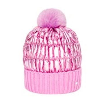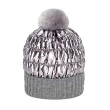 Cuffia bambina in nylon trapuntato arricciato con risvolto e pom pon in ecopelliccia.