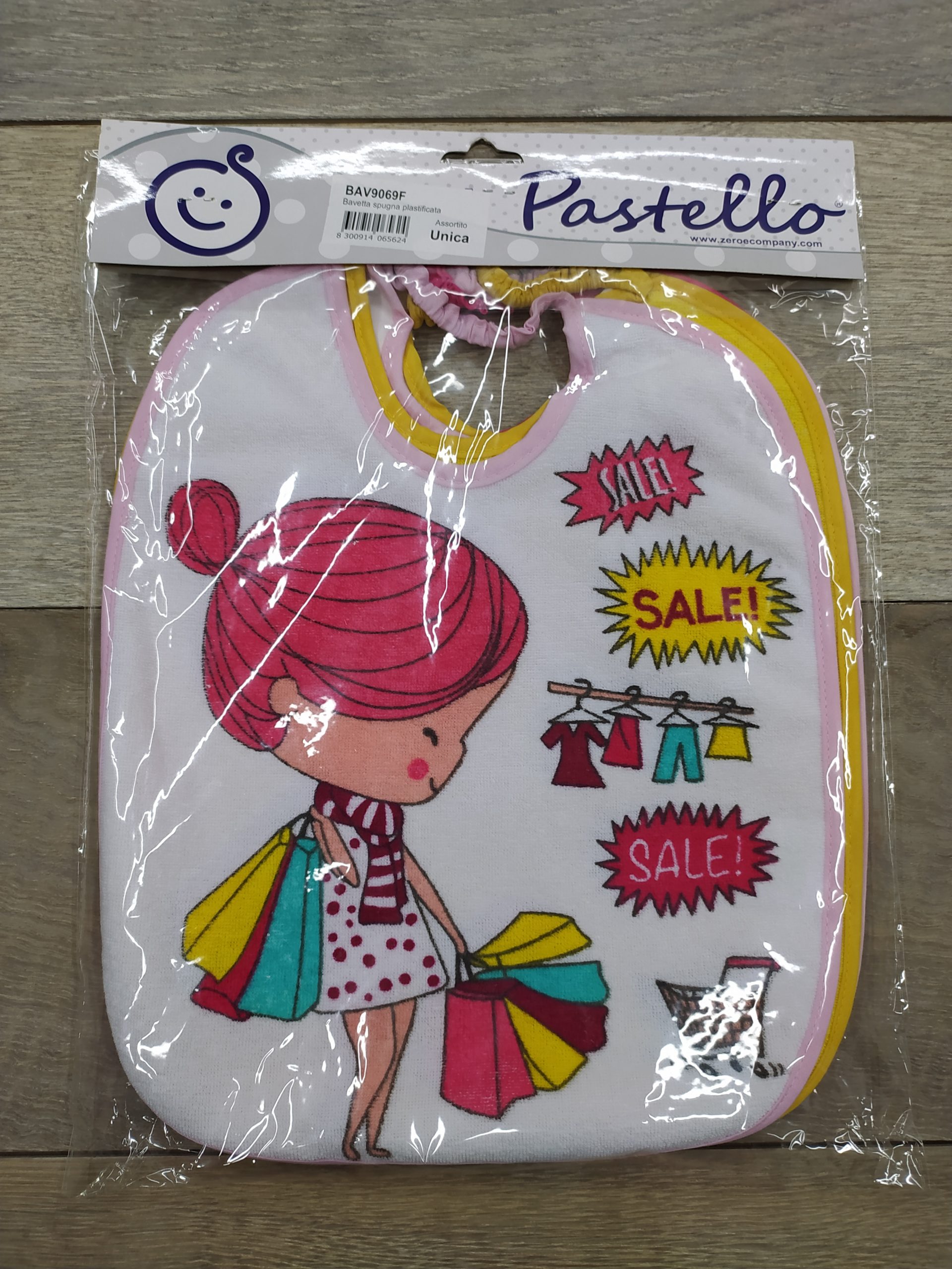 Bavaglia spugna con elastici con retro plastificato stampata confezione da 6 pz.